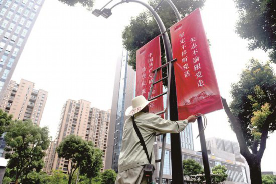 慶祝建黨節的燈光秀、公園和路邊懸掛的國旗